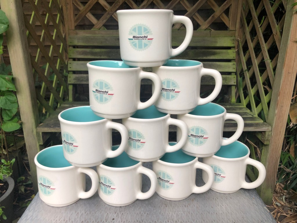 Right: A pyramid of mugs handmade for the UK Bianchi Owners Club.